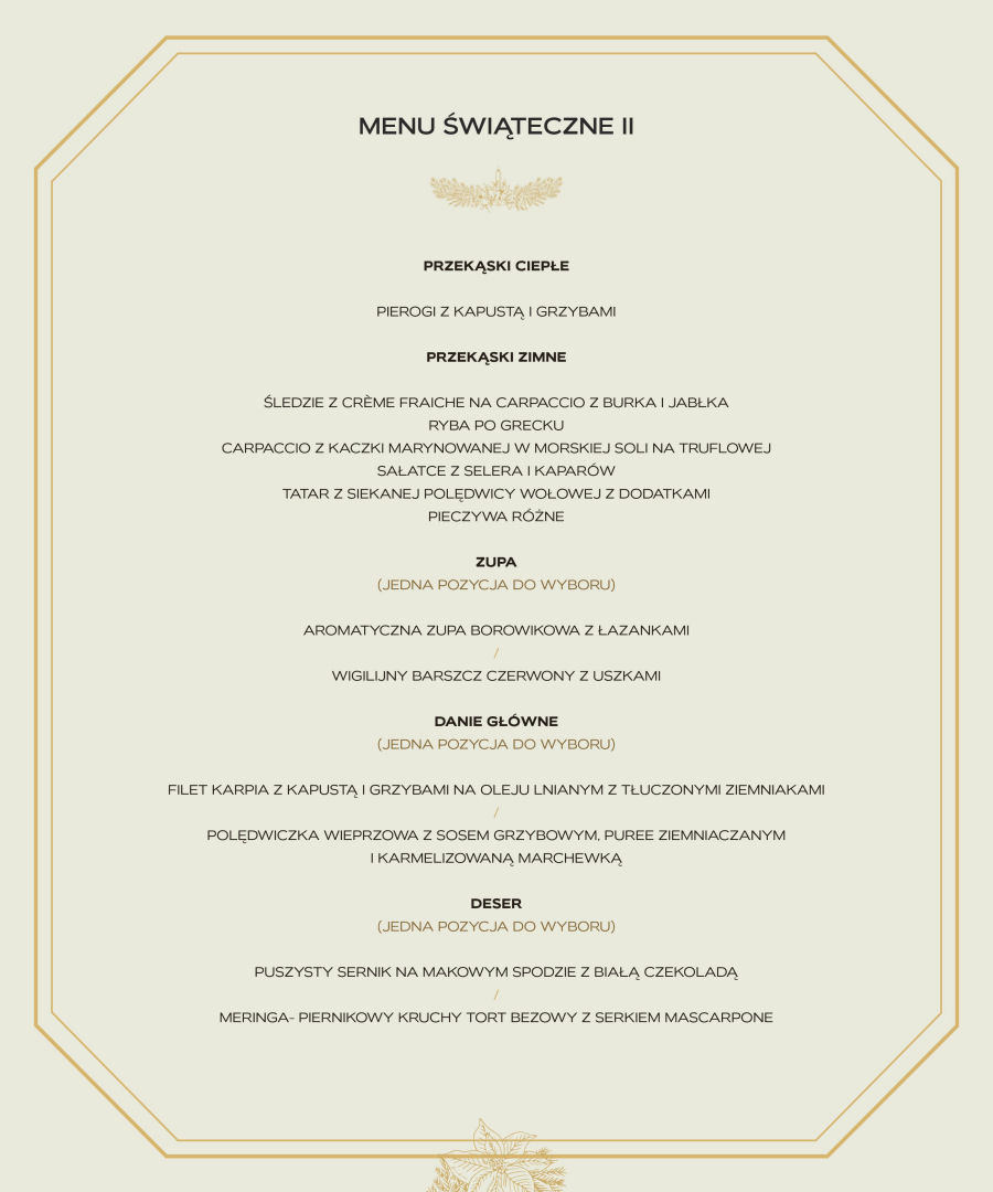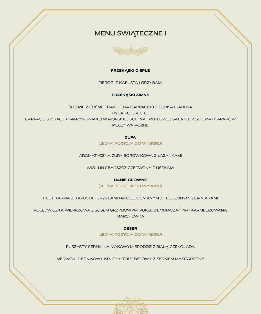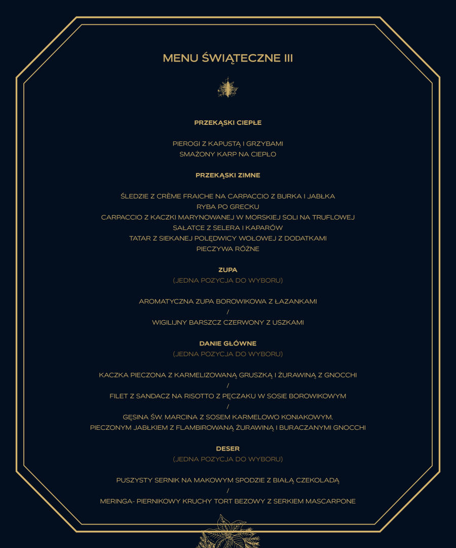 Zapoznaj się z naszą ofertą i różnymi wariantami menu wigilijnego, które oferujemy w tym roku. W razie jakichkolwiek pytań pozostajemy do dyspozycji.